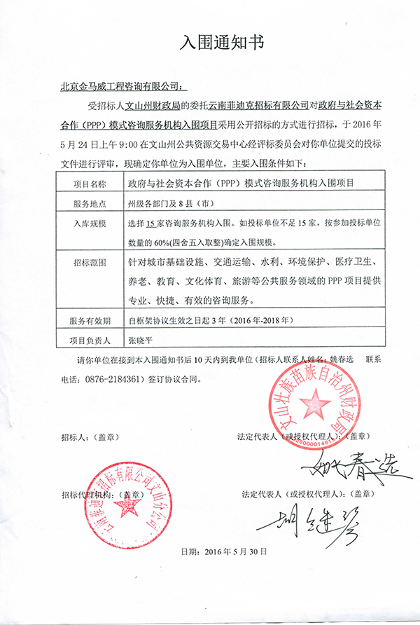 北京金馬威工程咨詢有限公司入圍“文山州財政局政府與社會資本合作(PPP)模式咨詢服務機構入圍項目”